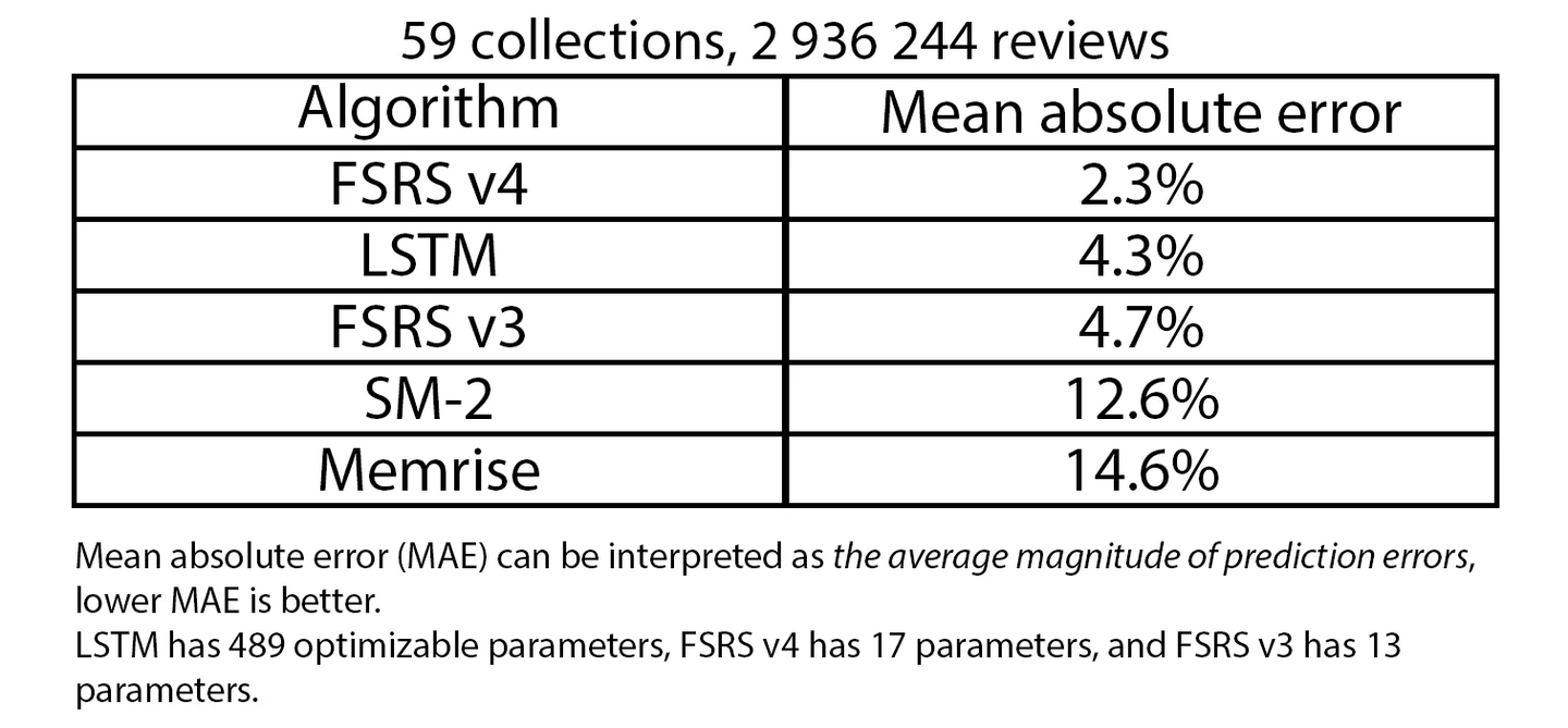 下面的表格基于 FSRS wiki 的这一页。所有 5 种算法都在大约包含三百万条复习记录的 59 个集合上运行,结果基于每个集合中的复习记录数进行加权平均。