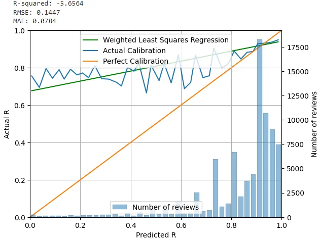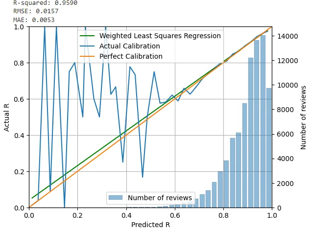 你可能会想:「等一下,当预测的 R 值小于 0.5 时,蓝线看起来就像垃圾!」但那是因为那个区域的数据实在太少了。这并不是 FSRS 的一个小缺点。事实上,几乎所有的间隔重复算法都会有这种表现,因为用户希望有较高的记忆保留率,于是开发者就制定了能产生较高保留率的算法。计算 MAE 时,需要根据各组内的复习数量对预测值进行加权,这就是尽管图表左下方部分看起来表现不太好,但 MAE 仍然很低的原因。