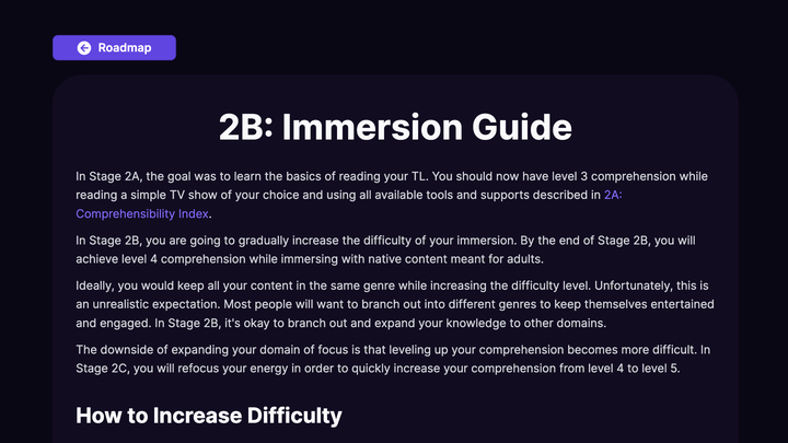 在阶段 2B 结束时,你应该精细沉浸在面向成年观众的内容中。面向儿童和青少年的节目仍可用于无阻沉浸,因为它们将有助于巩固和习得你已经获得的知识。