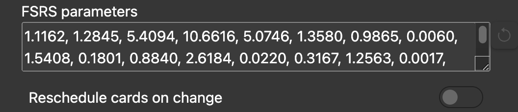 这个选项控制着在你启用 FSRS 或更改参数和期望保留率时,卡片的到期日期是否会改变。默认情况下,卡片不会被重新排程。这意味着未来的复习将使用新的排程,但你的复习量不会立即发生变化。这样可以从 SM-2 到 FSRS 平稳且逐渐过渡。