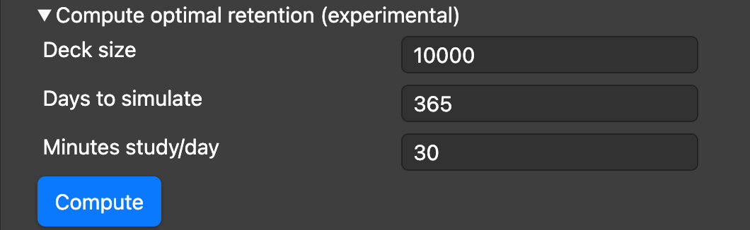 这是一种试验性工具,旨在计算出一个最大化在给定时间限制(「每天学习分钟数」)内总知识量的期望保留率。简单来说,它试图找到一个能让你的学习计划最高效的期望保留率值。它通过分析你在卡片上花费的时间,以及你按下「困难/良好/简单」按钮的习惯来实现这一目标。
