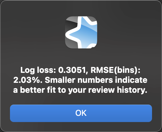 你可以使用「优化 FSRS 参数」部分中的「评估」按钮,查看一些指标,这些指标显示「FSRS 参数」字段中的参数与你的复习历史的契合程度。数字越小,表示与你的复习历史契合得越好。