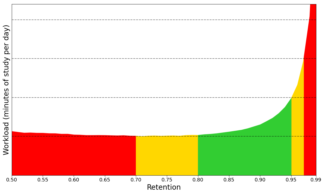 建议的保留率将极大地依赖于你的输入,如果它与 0.9 相差很大,这表明你每天分配给学习的时间对于你试图学习的卡片数量来说,要么太少,要么太多。