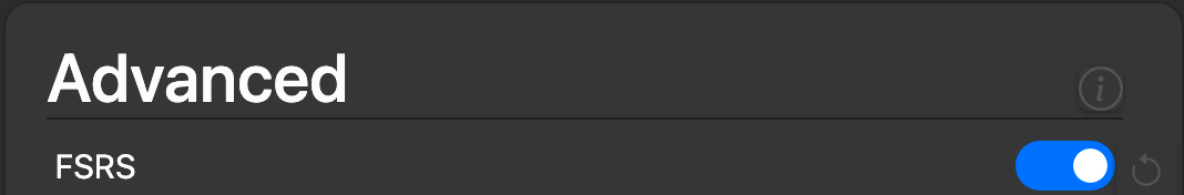 要启用 FSRS,请进入「牌组选项」,向下滚动至「高级」部分,然后开启 FSRS 开关。这个设置会应用到所有牌组预设上。请注意,启用 FSRS 后,某些设置会消失,比如「毕业卡片再现间隔」、「初始简易度」等等。这是因为在启用 FSRS 时,这些设置就没用了。