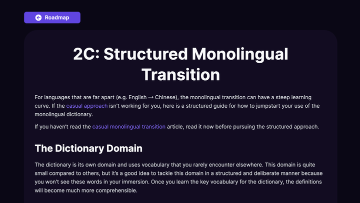 对于差异极大的语言(如英语→汉语),单语过渡可能会遇上陡峭的学习曲线。如果自然方法[1]对你无效,这里有一个结构化的指南,可以帮助你开始使用单语词典。
