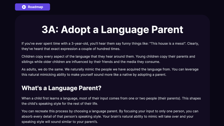 在阶段 3B,你将继续沉浸学习你的语言家长,直到你能自动、不假思索地理解他们。同时,你也会开始刻意模仿他们,进行一种叫做「影子跟读法」的练习。