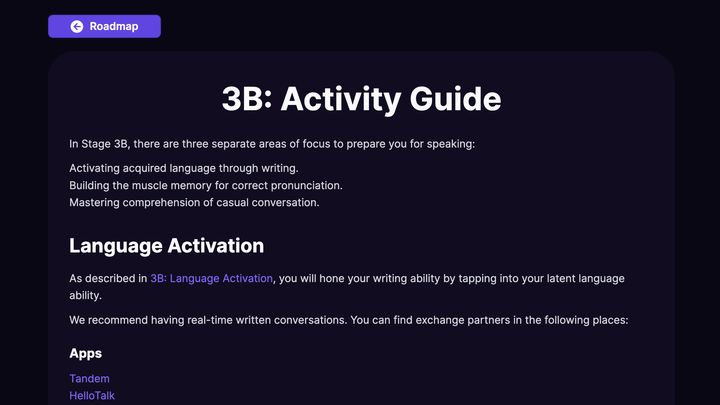 这部分内容与 3A:活动指南[3]无异。继续沉浸在你的语言家长、文字聊天以及脱口秀节目中。
