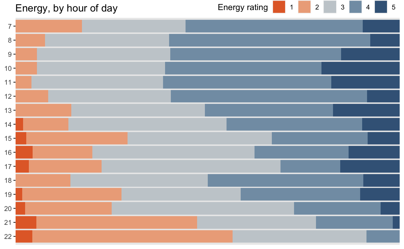 多年来,我一直使用这款应用来做有关我的能量水平的实验。在重新审视这些数据,特别是结合我对会议安排的考虑时,很快就发现了一个明显的规律。以下是我一年的数据(每小时大约 50-75 个样本):