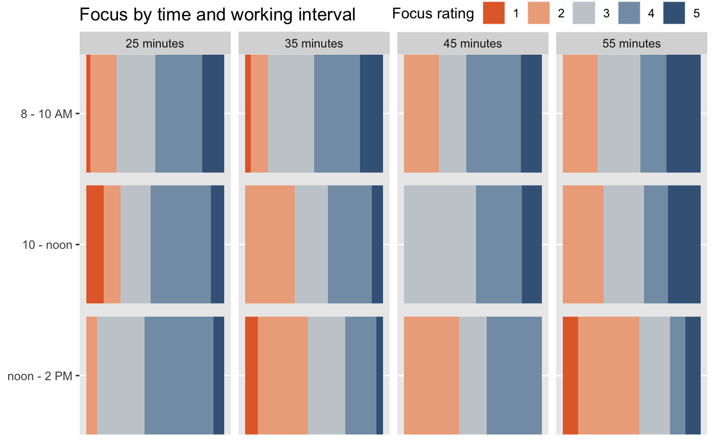 那么,更长的工作间隔是否更好呢?或者在专注上付出的代价会不会超过减少休息时间的好处?为了找出答案,我进行了一个实验。每天早上,我会随机选择一个工作间隔:25 分钟、35 分钟、45 分钟或 55 分钟,休息固定为 5 分钟[7]。我记录了一份包含主观专注度评分和任务信息的时间表。这个实验持续了 40 天,每个间隔各试验 10 天。