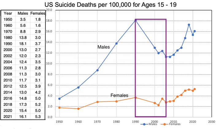 这是我「D」系列信件的第三篇,探讨的是 1950 年至今青少年(尤其是男孩)自杀率的剧烈变化,具体数据如下图所示。在 D1[1] 中,我展示了这张图表,并请读者对曲线的各个阶段做出分析。在 D2[2] 里,我阐述了男孩自杀率为何远高于女孩,接着讨论了 1950 至 1990 年期间自杀率(特别是男孩)持续急剧攀升的可能原因。