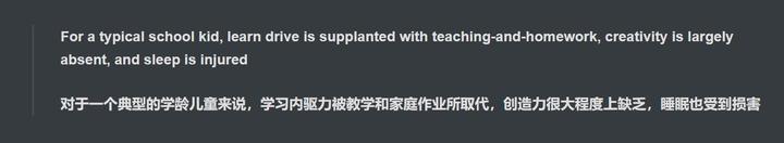对于一个典型的学龄儿童来说,学习内驱力被教学和家庭作业所取代,创造力很大程度上缺乏,睡眠也受到损害