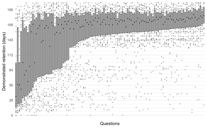 这个趋势在下面的图表中表现得更为明显,展示了 5 轮复习后,每个问题的记忆保持时间。这里的每一「栏」都是针对一个问题的箱形图,每个读者都是其中的一个数据点。