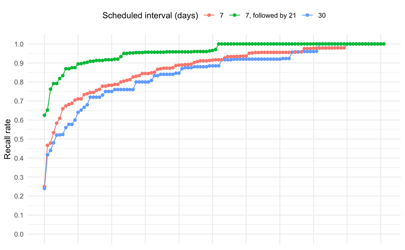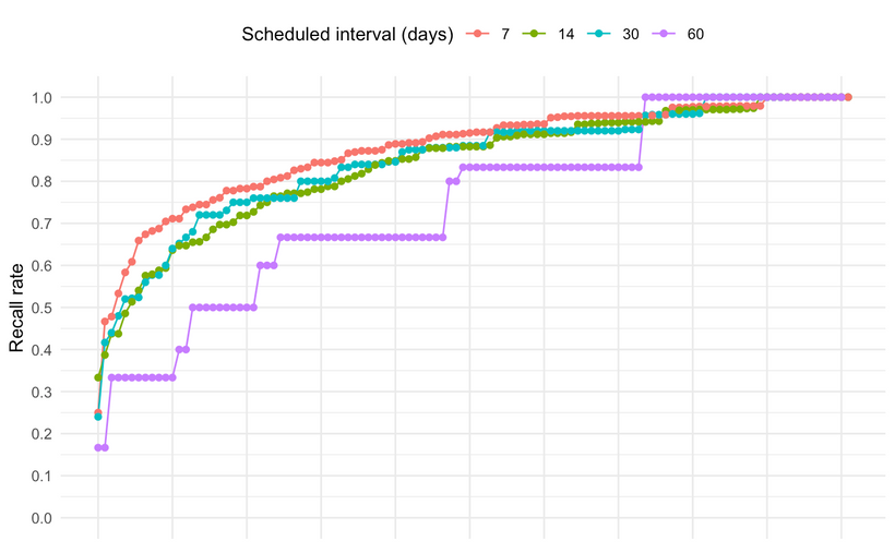 当然,有许多关于这个主题的论文,但都涉及构建遗忘曲线的预测模型,而我一直在特立独行地避免这样做,专注于数据中直观可见的模式。但我并未成功。如果我想深入探讨这个成本/效益问题,我预计需要构建一些模型。