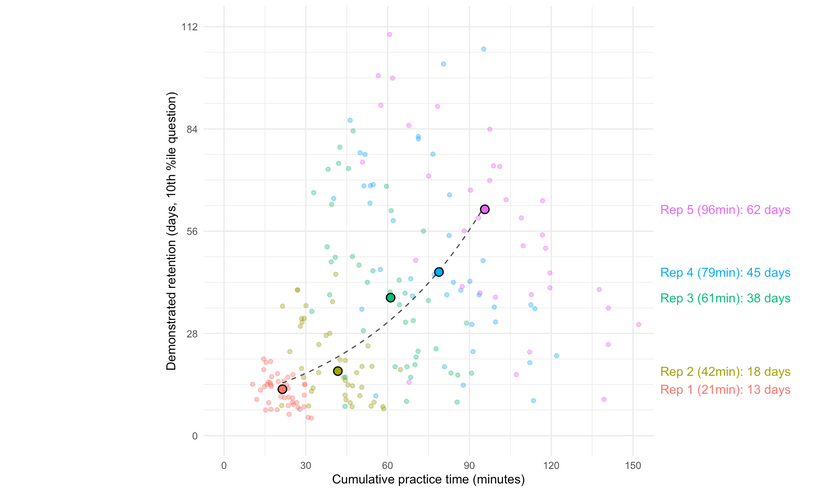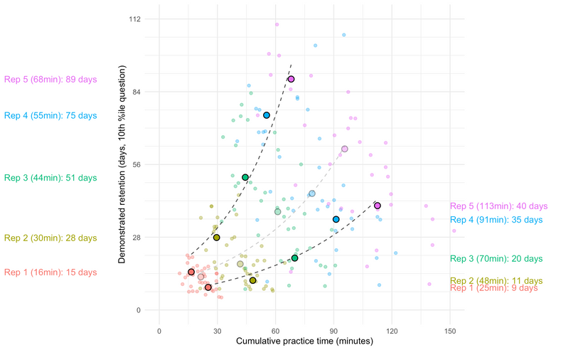 简单解释一下图表:每个点都代表了某个读者在完成一次复习后的数据记录。纵轴是他们记忆稳定性——他们能够成功回忆出 90% 以上问题的时间间隔——的总体评估。横轴是他们完成该次复习所花费的时间。图表中「突出显示」的点表示每次复习的中位数;虚线则是指数拟合曲线。