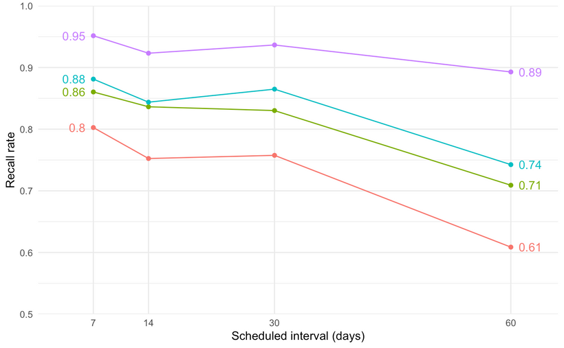 到目前为止,通过将读者展示的记忆保持定义为 90% 以上的问题所达到的间隔,我所展示的图表汇总了文章中的所有问题。但如果我们深入到一个更细致的层面,就能看到很多有趣的细节。