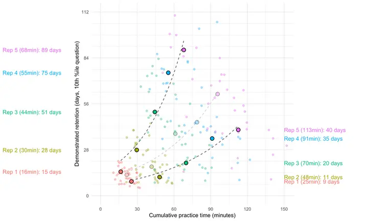 说得通俗点,大多数读者只需练习半小时,就能记住文章里几乎所有 112 个问题的答案,而且这种记忆能保持至少 2 周;如果练习时间增加到 1 个小时,记忆保持时间能延长至少 5 周;1.5 小时的练习则可以使记忆保持至少 9 周。注意到了吗?随着练习时间的增加,记忆保持时间呈指数增长。