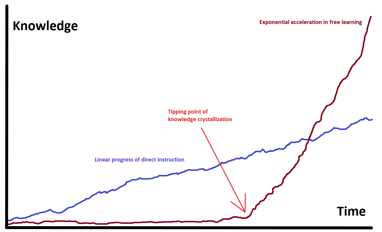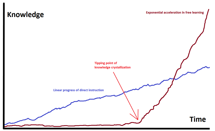 在自由学习[1]中相当常见的一个现象是,某个看似停滞的领域突然快速爆发,成长速度出乎意料(比如阅读能力的跃进)。尽管自由学习在接受学校教育的人群中基本绝迹,但大多数孩子在上学前的表现却能给我们以启示,比如说语言发展。对于那些语言发展迟缓的孩子,他们的变化尤其明显:在几个月内从一个哑巴变成一个话痨。学走路或学骑自行车也是如此,即便这些技能发展基于程序性学习[13]。所有这些飞跃背后的知识结晶[14]机制是相同的。