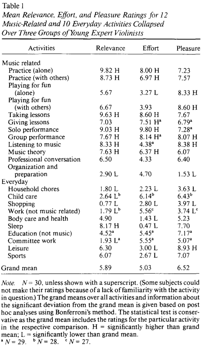 在 1993 年的一项研究中,Ericsson 展示了一些证据,这些证据来自于对小提琴手的日记研究。单独练习的乐趣评分是 7.2 分,虽然比随意弹奏(8.3 分)低,但和独奏(7.3 分)差不多,还比学习音乐理论(6.1 分)或总体平均分(6.5 分)要高。
