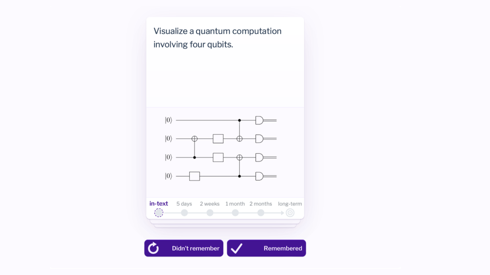阅读几分钟后,文章会被一些小测验打断。这些问题设计得很简单,每个只需几秒钟:在心里想出答案,然后标记自己是否答对了。到目前为止,这些看起来像是简单的抽认卡。但正如我们讨论过的,即使你现在能回答这些问题,并不意味着几周甚至几天后你还能记住。