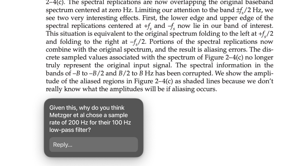 现在,Sam 继续深入学习带通滤波器。但是,这些通过简短聊天得到的宏观解释感觉完全不够充分。什么是频域?什么是奈奎斯特率(Nyquist rate)?Sam 可以复制一些 AI 生成的代码,但他完全不明白其中的原理。显然,聊天界面并不是进行长篇概念解释的理想媒介。是时候进行更深入的学习了。