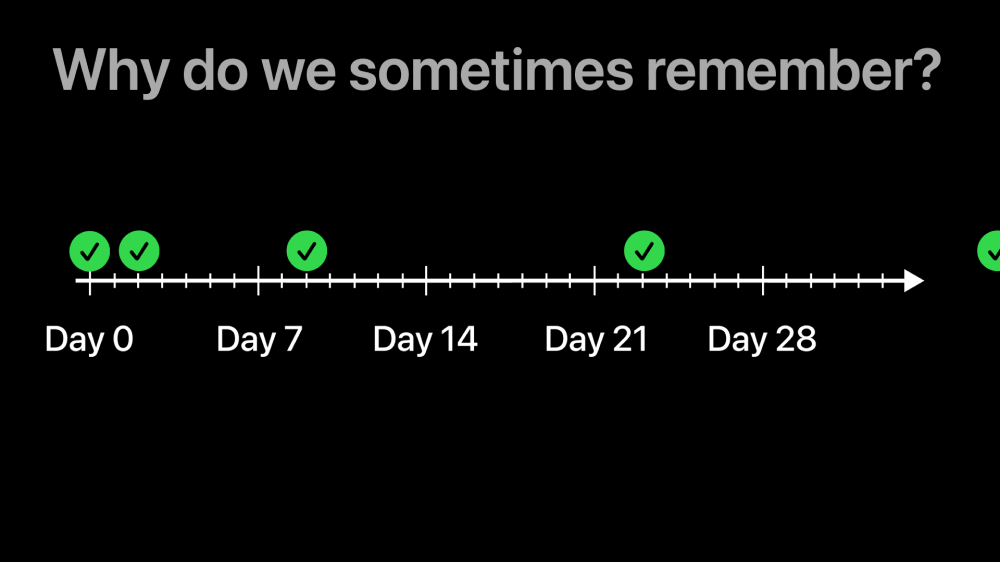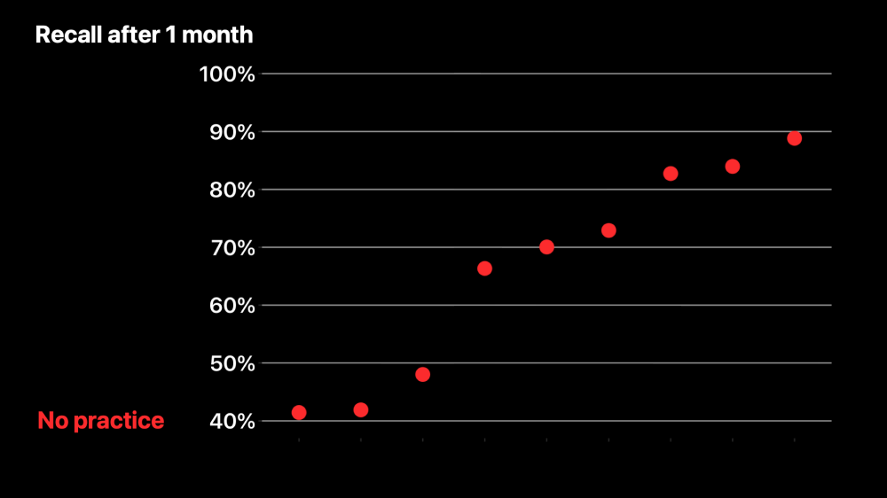 另一组用户在阅读文章时进行了练习,就像我们刚才在视频中看到的那样。对于他们忘记的问题,第二天还有一次额外的练习。然后这些问题消失了一个月,再进行测试。这些读者表现明显更好,尽管仍有一部分人答错了一些问题。