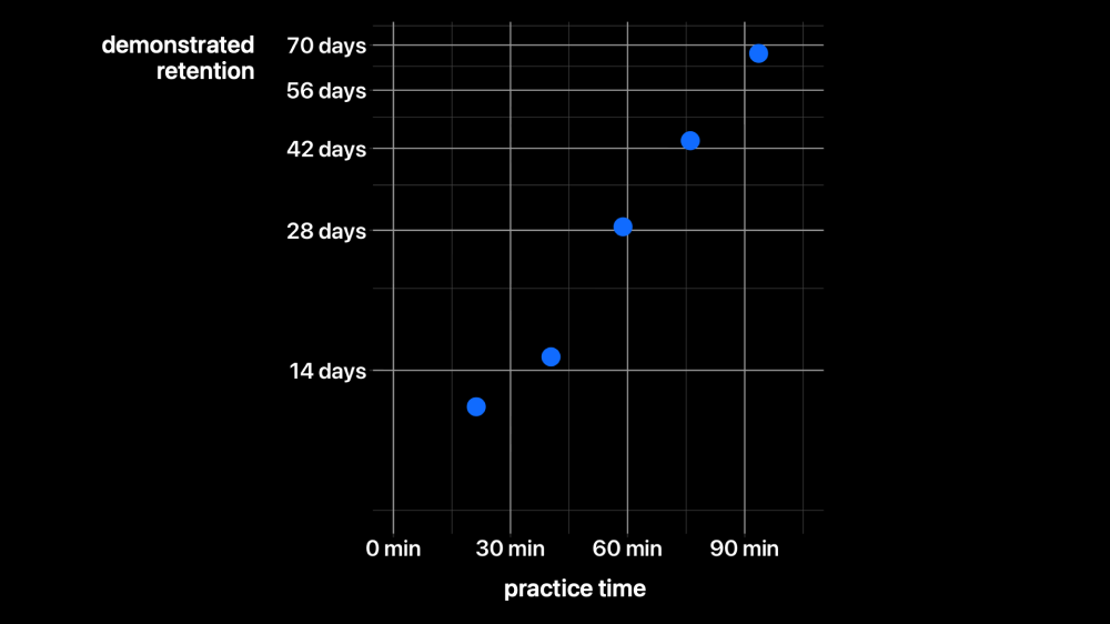 我们现在有数百万条练习数据,可以开始看到它的效果。这张图展示了练习所花的时间(x 轴)与读者的展示记忆保持(y 轴)之间的关系。展示记忆保持指的是读者在不练习的情况下,能正确回答至少 90% 问题的时间长度。这五个点代表了中位用户在第一章中的前五次重复练习。注意,y 轴是对数刻度,所以我们看到的是一个漂亮的指数增长。每次额外的重复练习——持续的额外投入——会带来越来越多的产出——也就是展示记忆保持的提高。