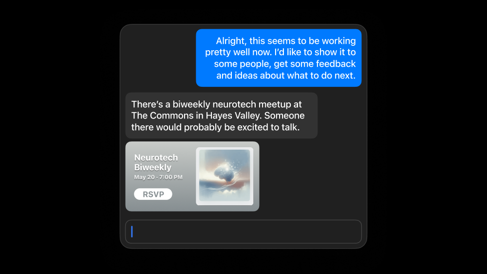 正如我们的 AI 能帮助 Sam 找到进入这一领域的可行途径,它也能促进与实践社区的联系——这里推荐了一个当地的神经科技聚会。于是,Sam 参加了神经科技活动,结识了一位当地的科学家,并约定了咖啡会面。在获得许可后,Sam 记录了这次会面,预感到这些笔记日后可能会有用。