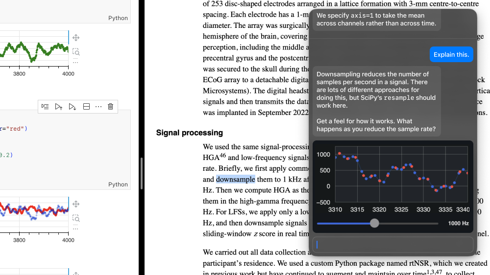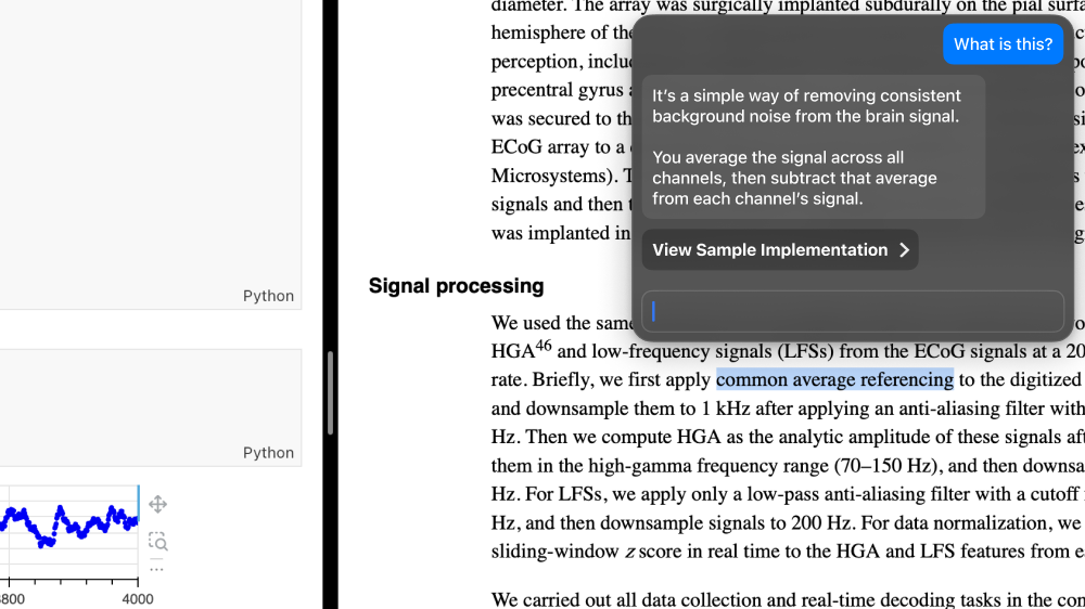 于是,Sam 开始全身心投入。他找到了一个开源的数据集,并迈出了开始工作的第一步。像 Copilot 这样的工具能帮助 Sam 起步,但要跟随这些信号处理步骤,Sam 真正需要的是一种不仅能够理解代码,还能了解论文内容,并知道 Sam 正在尝试做什么的 Copilot。