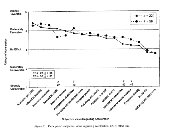 考虑到加速教育的成功,我们是否应该更广泛地采用这种方式?从一个角度来看,加速教育似乎已经成为一种广泛使用的工具,用来满足天才学生的需求。根据 SMPY 的调查,在数学能力最顶尖的万分之一的学生中,将近一半的人经历过跳级,而几乎所有人都接受过某种形式的加速教育,包括高级课程、提前进入大学或其他方式。约三分之二的学生表示对自己的加速教育感到满意,并在多个方面给予了积极评价: