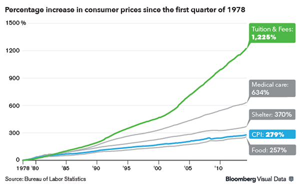 支持这一观点的一个有力论据是:我们在基础教育领域观察到的现象,同样也在高等教育领域上演。经通货膨胀调整后,如今大学教育的成本约为 1980 年的 4 倍。