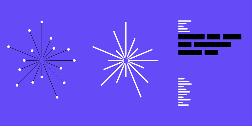 当可视化大型集合时,我们可以强调线条的 「尖端」而不是笔画(左)。在密集的列表环境中,星芒可以「解开」成垂直堆叠的线条,每一条仍然代表一张卡片(右)。