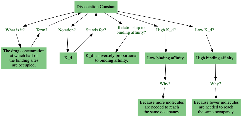 | 为什么 $K_d$ 值高表明结合亲和力低? | 因为需要更多的药物分子才能达到相同的占有率。 |