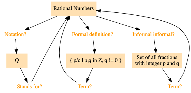 把你正在学习的概念视为一张图谱可能会有所帮助。在这张图谱中,每个节点代表一个具有特定属性的独立概念。而图谱中的边则是引导你从一个概念到另一个概念的问题。