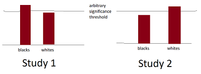 从图中可以清楚地看出,两项研究基本上得到了相同的结果,只是存在少许噪音。但是,由于统计显著性的判断,研究 1 不得不将其结果报告为「对黑人有显著影响,对白人无显著影响」,而研究 2 则必须报告相反的结论。这是否就是导致这些看似矛盾的结果的原因呢?
