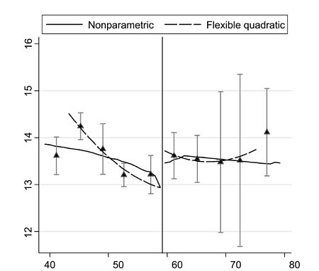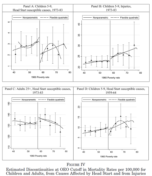 然而,研究人员还发现了一个关于高中毕业率的显著现象,他们称之为约 5% 的「正向断点」。具体而言,在美国最贫困的前 300 个县,儿童完成高中学业的几率比排名第 301 位及以后的县高出约 5 个百分点。这相当于平均多接受了半年的学校教育。值得注意的是,这种断点现象在「Head Start」(一项针对低收入家庭儿童的早期教育计划)实施之前并不存在,而且在那些因年龄原因无法参与该计划的儿童中也未观察到。这一现象恰好在 Head Start 计划启动时出现,且仅限于参与该计划的儿童群体。这是一个极具意义的研究发现。