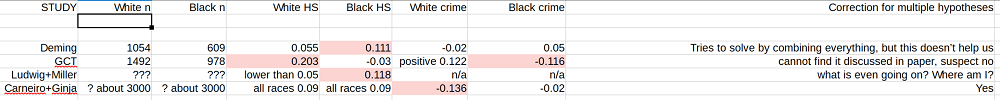 在这些研究中,黑人高中毕业率的结果最为一致,也最具说服力。Deming 的研究,以及 Ludwig 和 Miller 的研究都发现了积极效应。尽管 Carneiro 和 Ginja 的研究没有发现显著效应,但他们得出的效应量与其他研究相近。他们之所以没有得出显著性结果,可能是因为采用了更为严格的标准,这体现在他们对多重比较进行了调整,并检验了多个变量。事实上,他们确实应该采用更严格的标准。我试图为反对这一做法辩护,本质上是在否定他们恰当的研究方法,仅仅因为我想强行得出积极结果。然而,这正是良好的统计实践试图阻止我们做的事情。因此,我应该认识到这种倾向的不妥,避免这样做。
