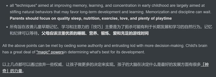 - 所有旨在改善儿童早期记忆、学习和注意力的「技巧」主要是为了扼杀可能有利于长期发展和学习的自然行为。记忆和纪律可以等待。父母应该注重优质的睡眠、营养、锻炼、爱和充足的游戏时间