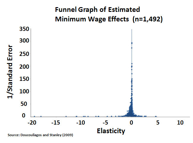 举个例子,在最低工资问题上,我注意到只有一方提供了漏斗图。漏斗图通常用于检测发表偏误,但它还有另一个用途——它几乎完美地呈现了我们前面讨论的「钟形曲线」。