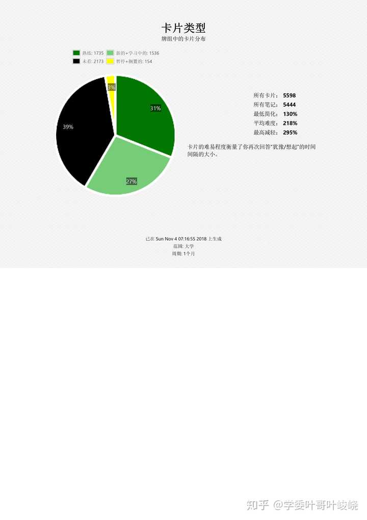 复习数量:过去 30 天的学习记录,以卡片数量为统计指标