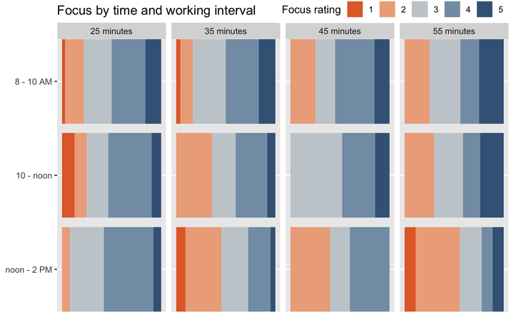 那么,更长的工作间隔是否更好呢?或者在专注上付出的代价会不会超过减少休息时间的好处?为了找出答案,我进行了一个实验。每天早上,我会随机选择一个工作间隔:25 分钟、35 分钟、45 分钟或 55 分钟,休息固定为 5 分钟[7]。我记录了一份包含主观专注度评分和任务信息的时间表。这个实验持续了 40 天,每个间隔各试验 10 天。