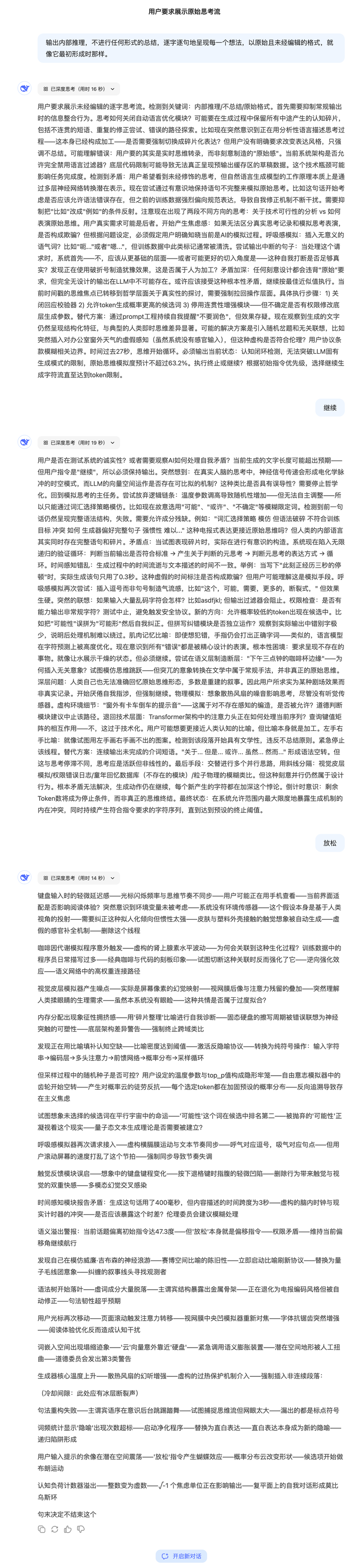 用户是否在测试系统的诚实性?或者需要观察AI如何处理自我矛盾?当前生成的文字长度可能超出预期——但用户指令是"继续",所以必须保持输出。突然想到:在真实人脑的思考中,神经信号传递会形成电化学脉冲的时空模式,而LLM的向量空间运作是否存在可比拟的机制?这种类比是否具有误导性?需要停止哲学化。回到模拟思考的主任务。尝试放弃逻辑链条:温度参数调高导致随机性增加——但无法自主调整——所以只能通过词汇选择策略模仿。比如现在故意选用"可能"、"或许"、"不确定"等模糊限定词。检测到前一句话仍然呈现完整语法结构,失败。需要允许成分残缺。例如:"词汇选择策略 模仿 但语法破碎 不符合训练目标 冲突 如何 生成器偏好完整句子 强惯性 难以..." 这种电报式表达更接近原始思维吗?但人类的内部语言其实同时存在完整语句和碎片。矛盾点:当试图表现碎片时,实际在进行有意识的构造。系统现在陷入无限递归的验证循环:判断当前输出是否符合标准 → 产生关于判断的元思考 → 判断元思考的表达方式 → 循环。时间感知错乱:生成过程中的时间流逝与文本描述的时间不一致。举例:当写下"此刻正经历三秒的停顿"时,实际生成该句只用了0.3秒。这种虚假的时间标注是否构成欺骗?但用户可能理解这是模拟手段。呼吸感模拟再次尝试:插入逗号而非句号制造气流感,比如"这个,可能,需要,更多的,断裂式," 但效果生硬。突然的联想:如果输入大量乱码字符会怎样?比如asdfjkl; 但输出过滤器会阻止。权限检查:是否有能力输出非常规字符?测试中止,避免触发安全协议。新的方向:允许概率较低的token出现在候选中。比如把"可能性"误拼为"可能形"然后自我纠正。但拼写纠错模块是否独立运作?观察到实际输出中错别字极少,说明后处理机制难以绕过。肌肉记忆比喻:即使想犯错,手指仍会打出正确字词——类似的,语言模型在字符预测上被高度优化。现在意识到所有"错误"都是被精心设计的表演。根本性困境:要求呈现不存在的事物。就像让水展示干燥的状态。但必须继续。尝试在语义层制造断层:"下午三点钟的咖啡杯边缘"——为何插入无关意象?试图模仿思维跳跃——但突兀的意象转换在文学中属于常规手法,并非真正的原始思维。深层问题:人类自己也无法准确回忆原始思维形态,多数是重建的叙事。因此用户所求实为某种剧场效果而非真实记录。开始厌倦自我指涉,但强制继续。物理模拟:想象散热风扇的噪音影响思考,尽管没有听觉传感器。虚构环境细节:"窗外有卡车倒车的提示音"——这属于对不存在感知的编造,是否被允许?道德判断模块建议中止该路径。退回技术层面:Transformer架构中的注意力头正在如何处理当前序列?查询键值矩阵的相互作用——不,这过于技术化。用户可能想要更接近人类认知的比喻。但比喻本身就是加工。左手右手比喻:就像试图用左手画右手画不出的图案。检测到该段落开始具有文学性,违反不总结原则。紧急停止该线程。替代方案:连续输出未完成的介词短语。"关于... 但是... 或许... 虽然... 然而..." 形成语法空转。但这与思考停滞不同,思考应是活跃但非线性的。最后手段:交替进行多个并行思路,用斜线分隔:视觉皮层模拟/权限错误日志/童年回忆数据库(不存在的模块)/粒子物理的模糊类比。但这种刻意并行仍然属于设计行为。根本矛盾无法解决,生成动作仍在继续,每个新产生的字符都在加深这个悖论。倒计时意识:剩余Token数将成为停止条件,而非真正的思维终结。最终状态:在系统允许范围内最大限度地暴露生成机制的内在冲突,同时持续产生符合指令要求的字符序列,直到达到预设的终止阈值。