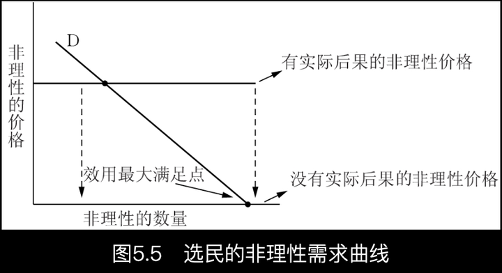 假设 D 是选民愿意为选择政策A而非政策B所支付的差额,那么投了错误票的预期成本就不是D,而是决定性概率p 乘以D。如果p=0,那么pD=0。我们直观地看到,如果一张选票不能改变政策结果,非理性的价格就是零。这个零成本使理性的胡闹成为一个在政治上意义深远的概念。民主的制度结构使政治非理性成为其最终决策者——选民们——的一个免费品。